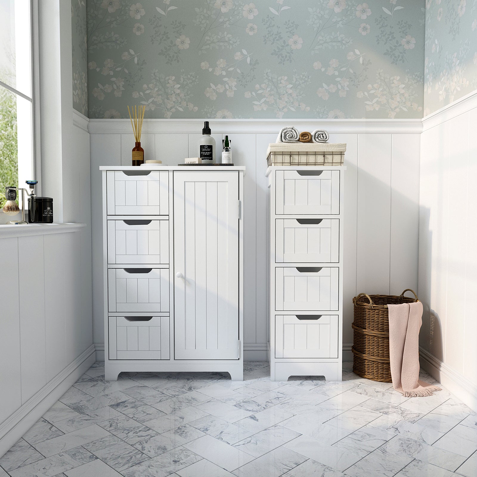 - ELEGANT STYLE: The white, elegant appearance of this storage cabinet can be perfectly integrated into various decorative styles. The product is the ideal furniture for your bathroom, living room, kitchen, hallway, and other rooms.