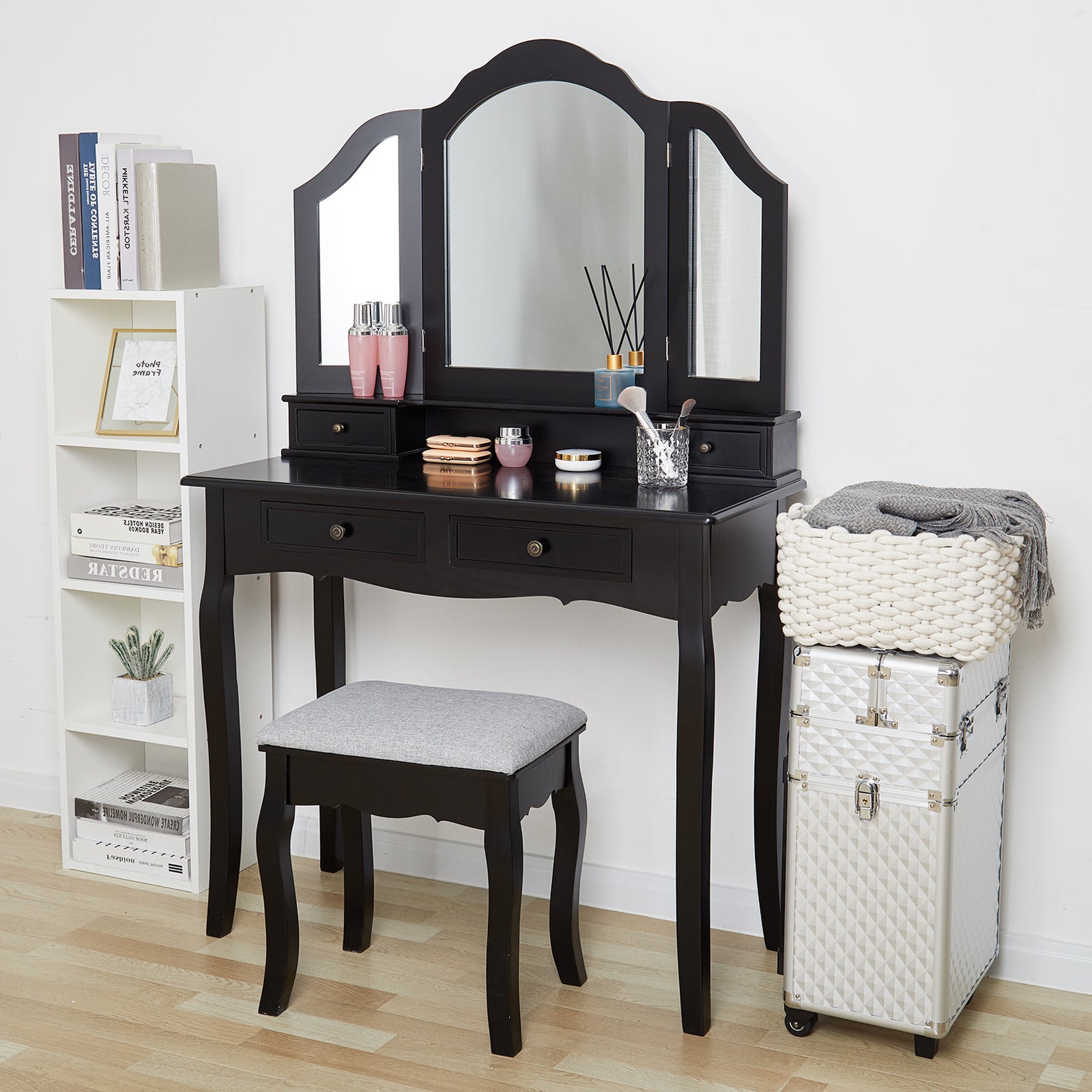 • Ample Storage Space:Dressing table size:90 x 40 x 146cm(L x W x H),size of stool: 40 x 30 x 46 cm (L x W x H), large drawer size:33.5 x 33.5 x 7.5cm(L x W x H), small drawer size:22.5 x 10 x 7.5cm(L x W x H),It has a large table top and 4 drawers for storing your cosmetics and daily needs. You don't have to worry about excessive cosmetics and messy tabletop.