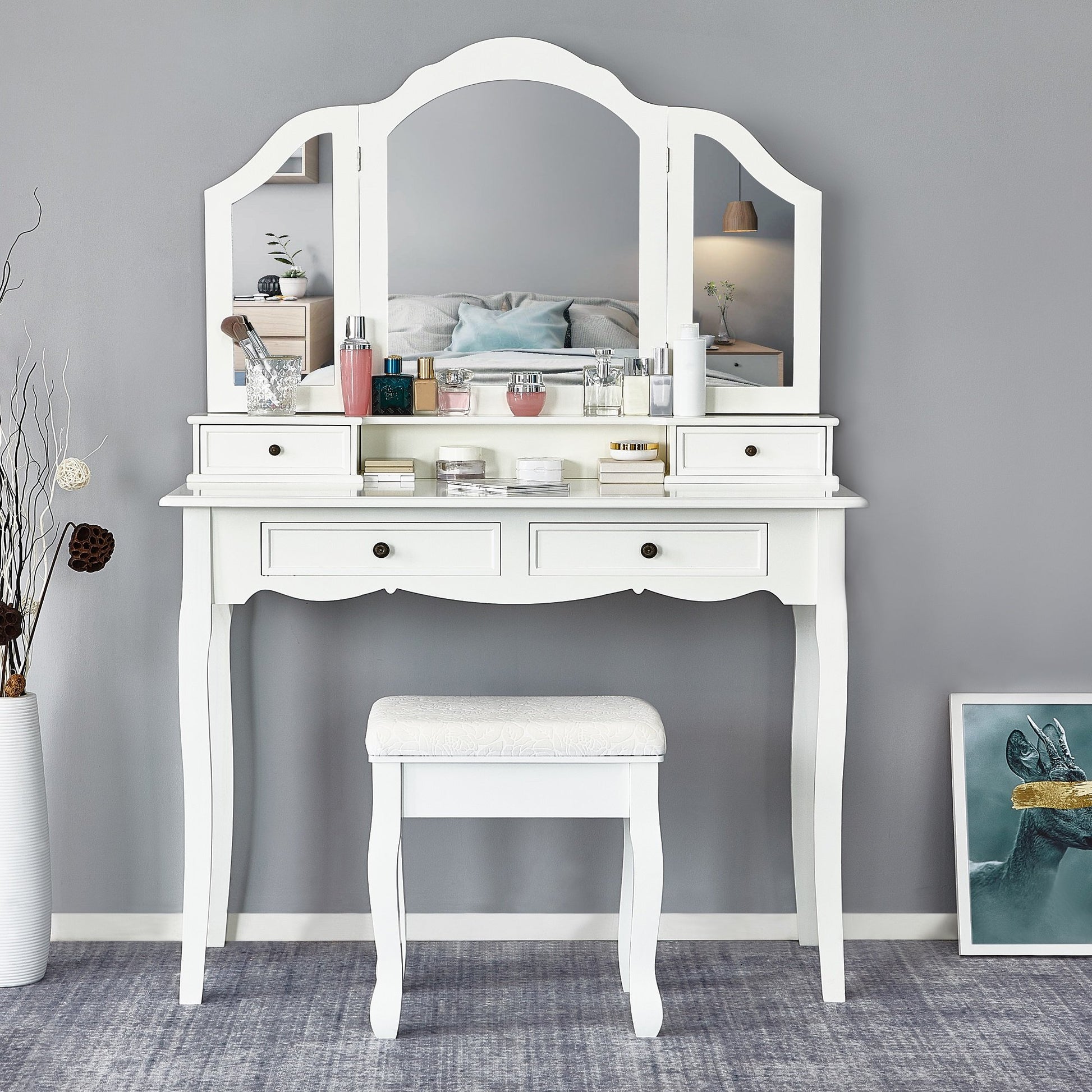 • Practical Structure: Large mirror can rotate 360 degrees; 4 drawers, 2 large drawers with anti-slip design provide ample storage space; 1 printed stool, whose seat cushion is made of flame-retardant material, is soft and comfortable; with a non-slip sticker that can be glued to the underside of the table and chair legs. If you remove the mirror, it can also be used as a normal table.