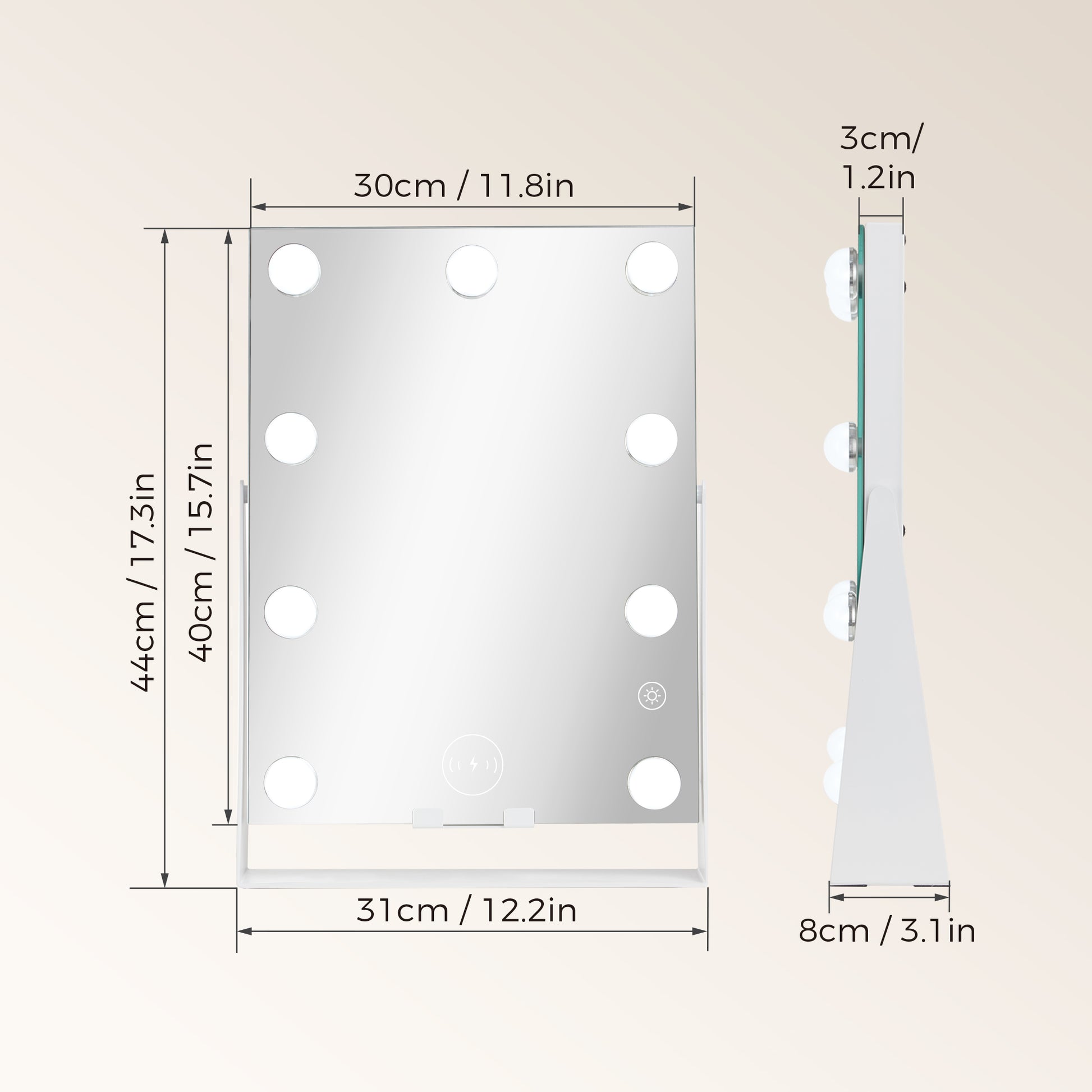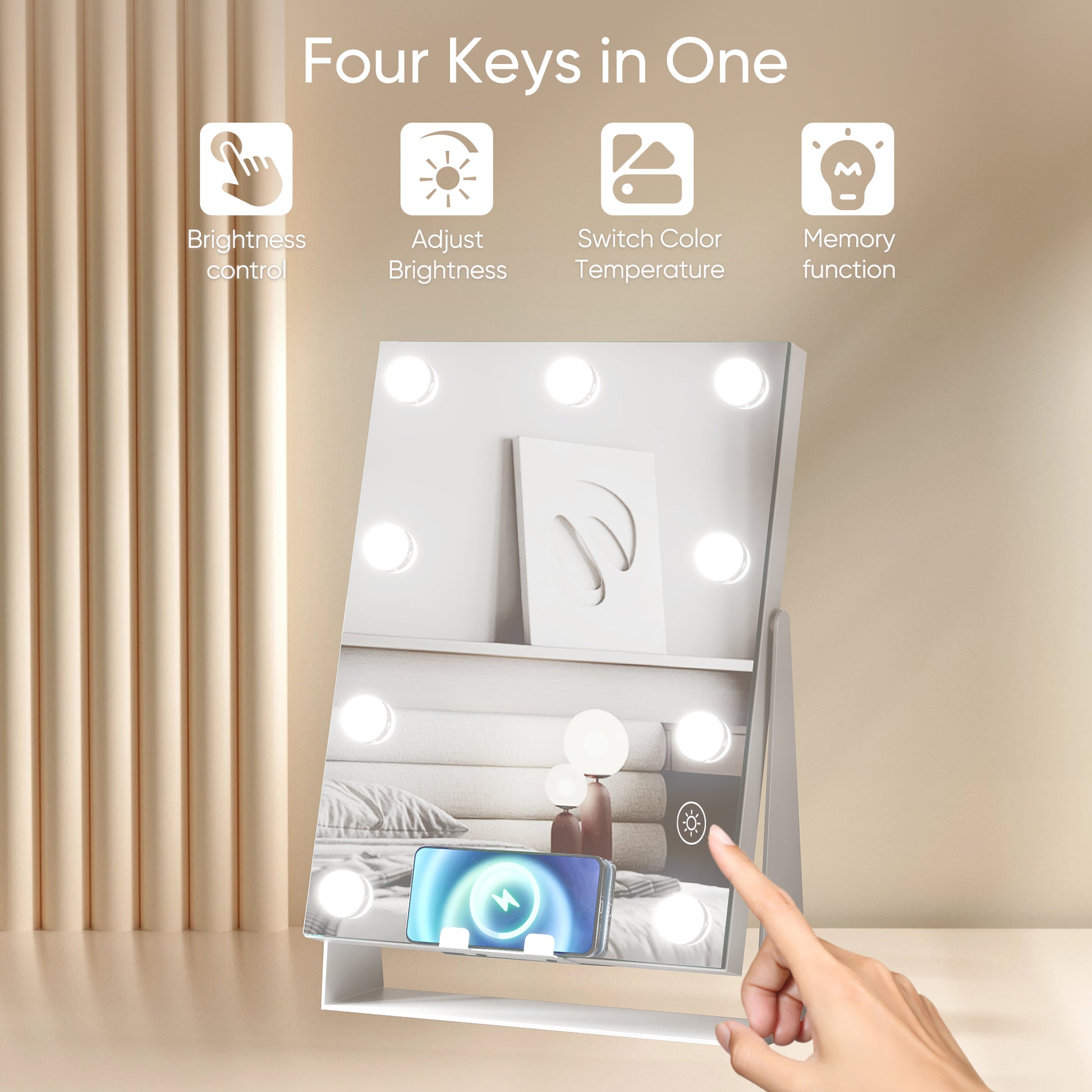 Mondeer Hollywood Vanity Mirror with Wireless Charging, Lighted Makeup Mirror with 9 Dimmable LED Bulbs, 3 Color Lighting Modes, Smart Touch Screen Control and 360° Rotation, White