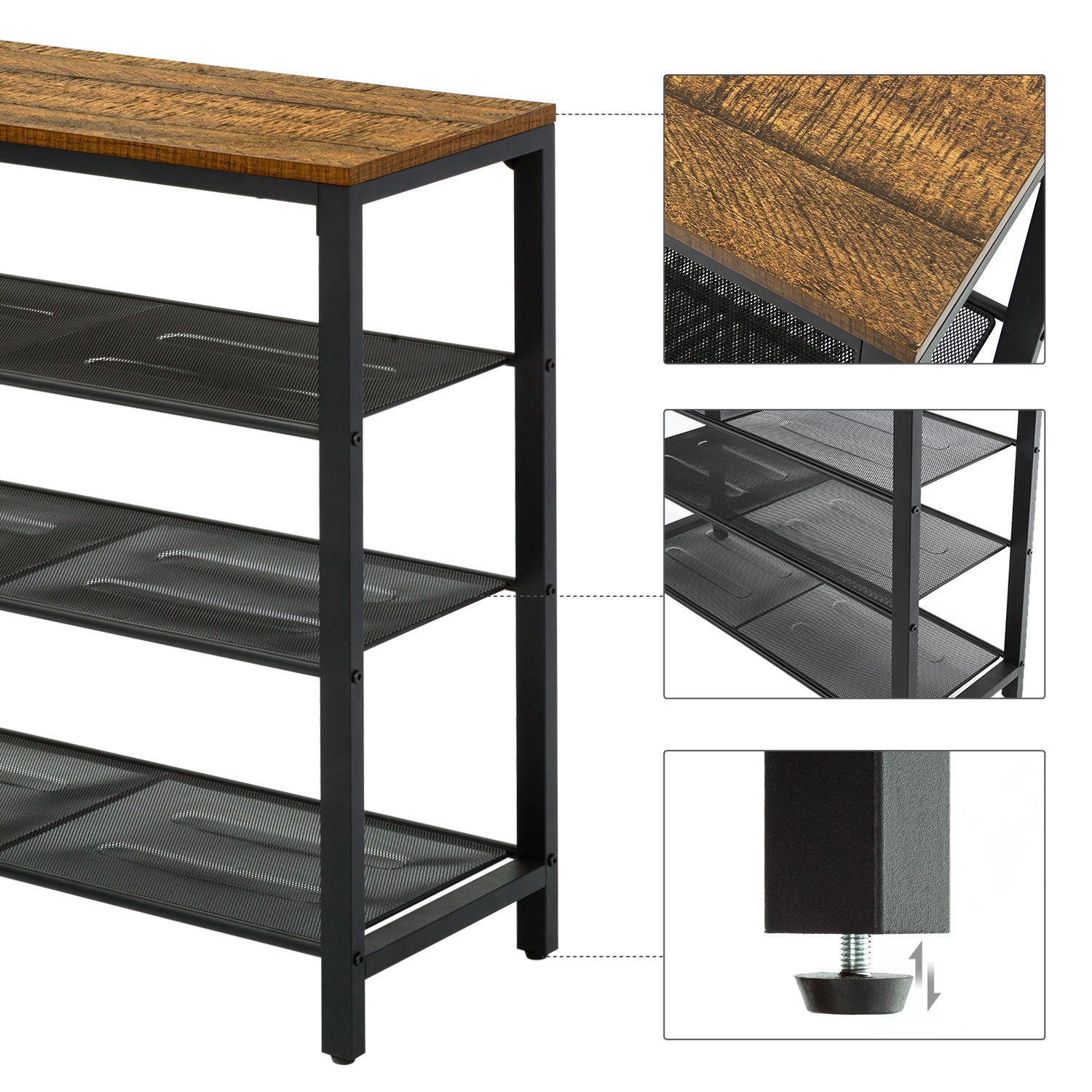 - Sturdy Construction: 15mm particleboard, surface triamine board, and metal frame are tightly integrated to ensure the stability of the shoe rack, equipped with 4 adjustable height feet provide stability even on uneven floors and prevent scratching the floor.